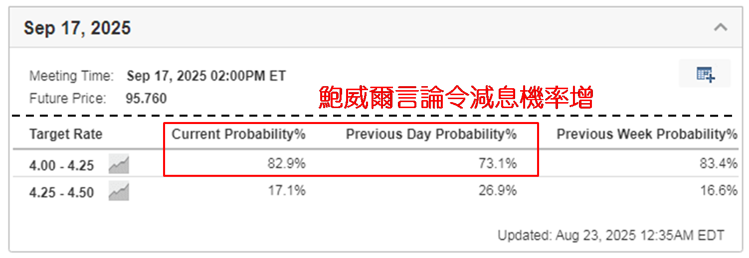 上周五美股三项主要指数同见强势,标指升逾1.50%,道指和纳指更双双升近1.90%。其中纳指更是三连跌后迎来大反弹,从8月20日一度低见20,905点,失守21,000点,周五却收于21,496点,逼近21,500点,从低位回升近600点,相信与上周五联储局主席鲍威尔在全球央行年会演讲内容有关。市场解读鲍威尔示意,通胀虽然仍有升温风险,但利率可能会下调,为9月联储局宣布减息带来憧憬。短短一日,减息1/4厘机率由73.1%,增至82.9%,令高度依赖债务融资的科技股受追捧。
