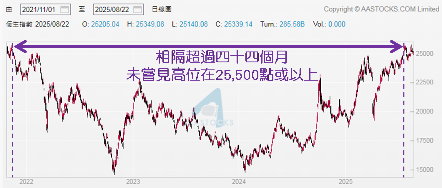 除了暂于2025年,上次恒指高位在25,500点之上,要追溯至2021年11月,当月亦仅见四个交易日而已。数据反映恒指上破25,500点,跟企稳在25,500点之上是两码子的事。从2021年11月18日至2025年7月22日相隔超过四十四个月未尝见恒指高位在25,500点或以上,换言之有投资者已持「蟹货」长近四年,目前恒指若要企稳在25,500点之上,必须将上述「蟹货」沽压全然消化方可成事。以往主要关注大权重科技蓝筹股表现,若见腾讯控股 (0700)、阿里巴巴─W (9988) 和小米集团─W (1810) 持续向好,可望抗衡「蟹货」沽压。