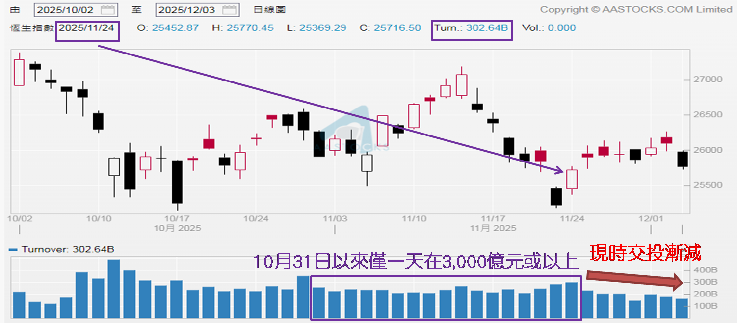 从11月25日至12月3日历时七个交易日,恒指收市位介乎25,760至26,095点,相距仅约335点,并且继本周一和周二 (12月1和2日) 见二连升后,周三止步跌逾330点,收报25,760点,为11月25日以来最低,也是期内首度收低于二万六关口。而本周过三个交易日大市成交金额分别约2,008亿、1,782亿和1,644亿港元,除了渐见减少,也是连续两日少于2,000亿元。自11月24日录得约3,026亿港元,是10月31日至今惟一超过3,000亿元的日子,继而出现减少趋势,上周三 (11月26日) 降至约2,071亿元,相距两日竟减近千亿元。及后于上周五、本周二和周三分别录得约1,462亿、1,782亿和1,644亿元。