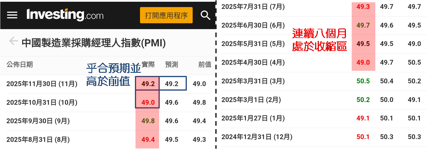 另可留意刚过去的周日 (11月30日) 内地公布11月官方采购经理指数 (PMI),其中制造业PMI录得49.2,虽乎合市场预期,亦高于10月的49.0;但始终处于50.0的盛衰分界线以下,维持在收缩区 (已连续八个月),官方解读是景气水平有所改善。不过紧接在周二标普全球发布的制造业PMI则为49.9,较10月的50.6为低,也低于市场预期的50.5,创4个月低点,以及回到盛衰分界线以下,市场解读期内新订单增速降至接近停滞,产量也随之停止扩张,制造商竞争加剧。面对数据好坏参半,增加港股后市走向的不确定性。