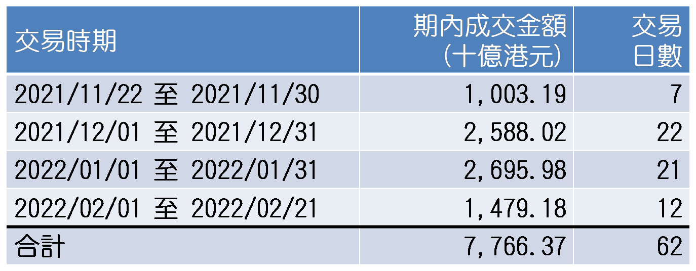 自2021年11月22日起收市位受制于25,000点,后来自2022年2月22日起则收低于24,000点。期内从2021年11月22日至2022年2月21日历时三个月共62个交易日,不是每日都收于24,000点或以上,只有29日成事,占比不足一半,意味着被套牢逾三年的「蟹货」,今明两日 (2月27和28日) 或下周可望微蚀或平手离场,并且上述62个交易日保守分析日均成交额不少于1,000亿元,合共便不少于6.2万亿元,实数更是超过77,660亿元,潜在沽压可想而知,故此不宜对后市大幅回调风险掉以轻心。这62个交易日的收市位平均值和中位数分别是23,960和23,989点,均未到24,000点,因此认为倘若由今年2月24日 (本周一) 计起的两周,恒指也未能收于24,000点或以上,可视为见顶讯号出现。倘若期内恒指见连续两日或以上收低于23,000点,更要有今次升浪已结束的心理准备。