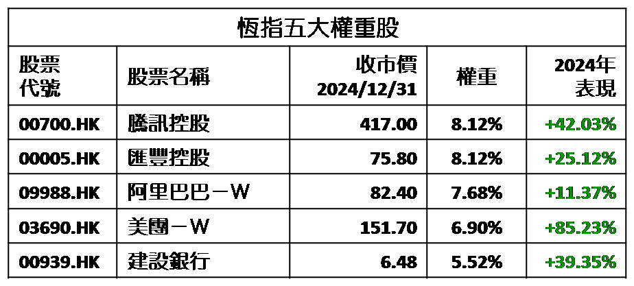 回看大市表现,2024年12月31日恒指收报20,059点,收高于20,000点,全年累升17.67%,终止2020至2023年连续四年跌市;同时表现为2018年以来最佳。恒指全年升逾17.00%亦优于美股道指累升不足13.00%,这是继2017年之后,相隔七年再度跑赢道指,绝对得来不易。至于恒指成份股表现,有28只跑赢恒指,占全数83只股份逾1/3。五大权重股当中表现最好是美团─W (3690),累升逾85.00%;其次是腾讯控股 (0700) 累升逾42.00%,若计及年内每股股息3.40港元,回报率提升至逾43.00%。