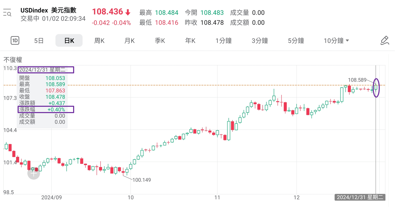 当中百威亚太累跌近49.00% (计入股息收益账面仍蚀逾47.00%),成为去年表现最差蓝筹股。另想指出年内升逾三成有16只蓝筹股,有8只具备「中特估」概念,占比一半。其中6只是中资金融股,为内银股和内险股。市场预期美国新任总统特朗普执政在即,或令通胀推高,联储局于2025年将放慢减息步伐,美汇指数于2024年12月31日急升0.40%至108.478,创2022年11月10日以来最高收市,现时人民币 (离岸价) 已弱见7.33000水平,考虑到内地经济表现向好有助人民币汇价靠稳。