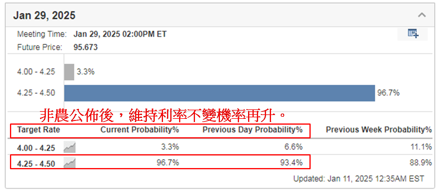 若由去年12月4日高见45,073点计起,约一个月累跌近7.00%。上周五美股大跌实则有迹可寻,皆因近期市场焦点不在美国经济表现,却在联储局减息路径上,自去年9月起三次议息,均见宣布减息,合共已减1.00厘,美国时间今年1月29日将迎来进入减息周期后第四次议息,利率期货于上周四显示维持利率不变机率为93.4%,于公布非农数据后增至96.7%,本身1月维持利率不变已无悬念。不过公布非农数据后美国银行业对利率走势看法改变,纷纷下调今年减息次数预期。