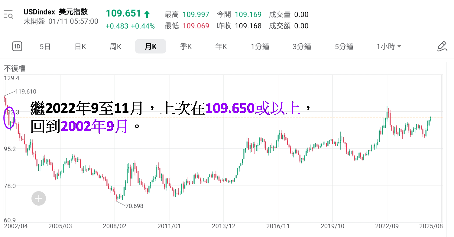 美汇指数亦见高企,公布非农数据后一度升穿110,是2022年11月以来高位,最终上周五收报109.651,若撇除2022年9至11月,再上次在109.650或以上,要回到2002年9月,反映现为超廿二年以来高水平。债息和美汇同处多年来高水平,同是预示美国联邦利率难有再减空间,毕竟特朗普扬言在1月20日就任总统便即随签署一项行政命令,除了向中国进口货加征关税以外,被视为盟友的墨西哥和加拿大进口货也会被加征关税。此举将推高美国物价,若联储局再减息将进一步推高物价,所以各国正为最坏情况作准备。
