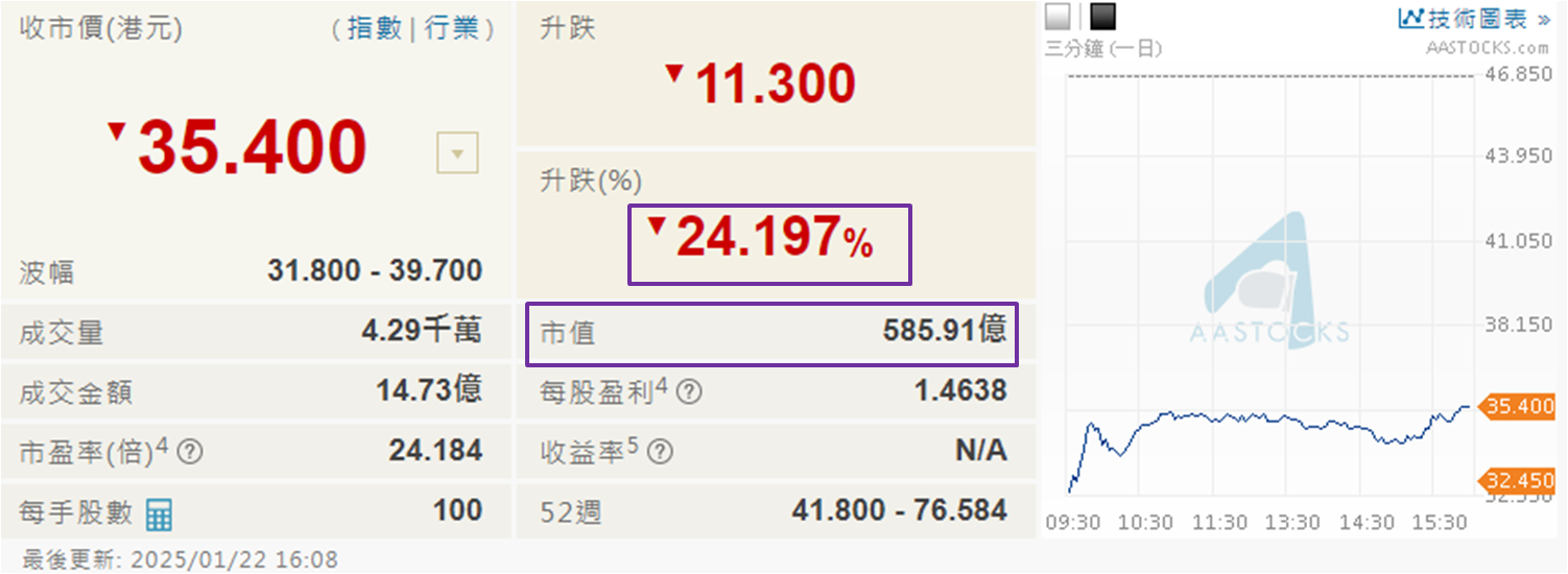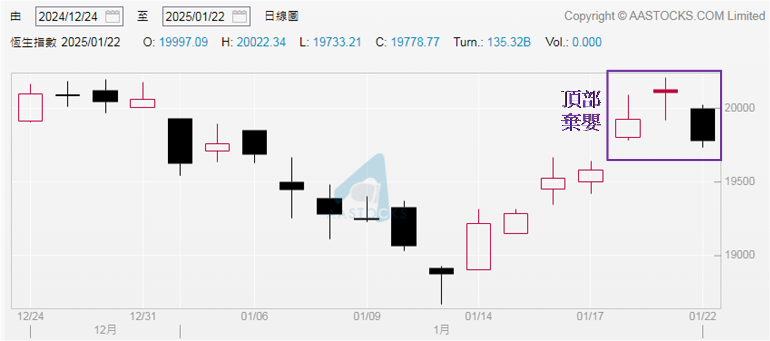 观乎新东方股价已回到2023年7月下旬水平,超过一年半低,春节假期前有望反弹,相信不会对恒指表现构成进一步负面影响。不过参考最近三日恒指收市位,并于周二见「十字星」,已形成「顶部弃婴」的利淡形态。此外,从1月14至21日恒指累升逾1,200点,较合理回调幅度约1/3,恒指应回到19,700点水平才见较大支持。昨日收报19,778点,略高于19,700点,配合「顶部弃婴」出现,相信本周余下两日恒指仍有下行压力。虽然如此,暂可庆幸港股升势未被破坏,前文已表示恒指回调时须留意万九关口能否守住,如今较此关口高出超过700点,加上特朗普上任美国总统当日美汇指数跌逾1.20%,回到108水平,对人民币汇价靠稳带来支持。