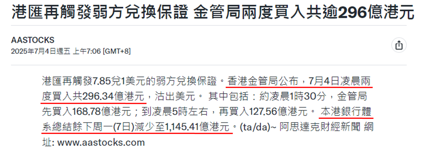 直得留意7月2日港股开市前,金管局又出手,斥资逾200亿港元,承接港元沽盘,较上周的94.2亿元多出超过一倍。上周五 (7月4日) 开市前则另一次出手,实则两度入市,分别涉资168.78亿和127.56亿元。约一周便四度入市,合共承接超过590亿元,银行体系结余降至1,145.41亿元。目前港汇仍徘徊在7.85附近,本周金管局仍可能要接盘,届时银行体系结余落到少于1,000亿元机会大。笔者提出仍要接盘,基于观察银行同业拆息 (HIBOR) 走势,于6月25日 (首度接盘前一天) 隔夜拆息为0.02071厘,于7月4日为0.02982厘,后者高出近44%。