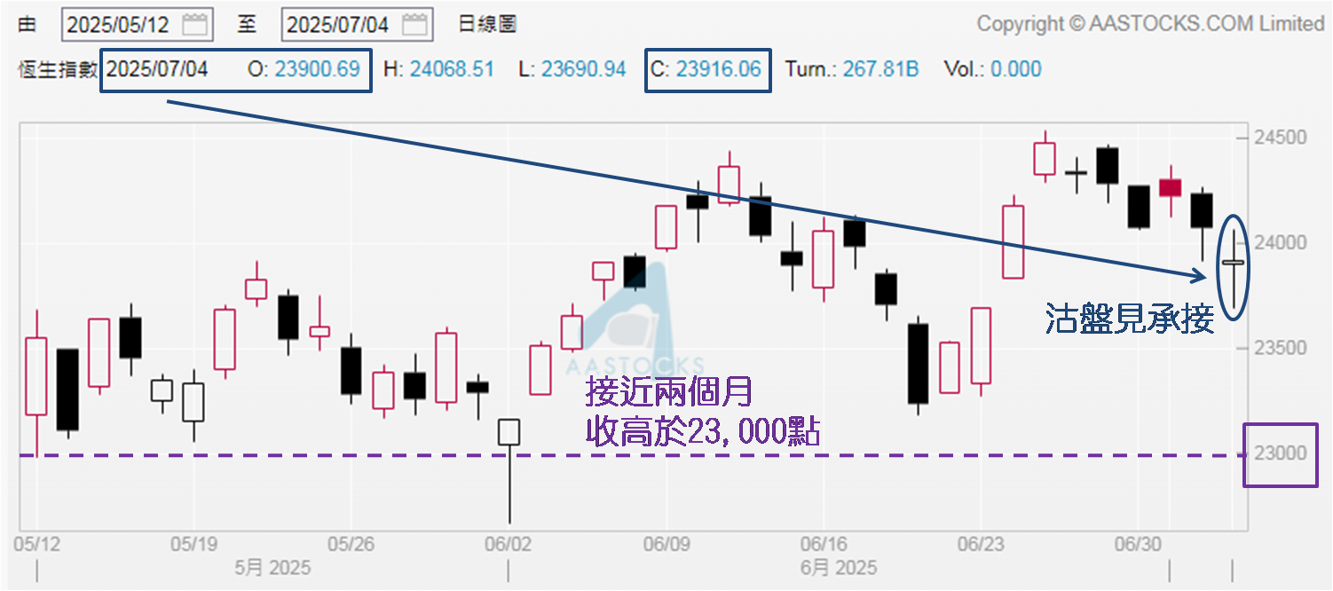 于6月30日发布的市评文章命题写到「金管局接港元沽盘后港股走弱 本周关注恒指能否守二万四关」,两部分都已见于港股上。前文表示于6月26日港股开市前数小时,触发弱方兑换保证,金管局继2023年5月,相隔超过两年后,再度买入港元,以捍卫联系汇率。当日恒指跌近150点,并于紧接两个交易日 (6月27和30日) 续跌,三日累跌逾400点,6月最后交易日收报24,072点,距离二万四关口不足百点。7月首个交易日红盘高收,以为下半年开局好势头能持续,翌日跌逾150点,将7月2日升幅消息殆尽。