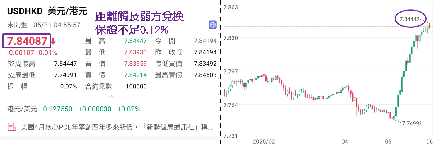 若情况严重,可能导致产量减少,甚至车厂生产线暂停。《路透》记者得到车厂联盟回复,指有关情况暂时未获改善,情况令人担忧。市场认为美国将有举措向中国施压,考虑撤销中概股在美上市地位应是手段之一。另外,港股自5月6日起持续走弱,亦不利港股表现,美国时间上周五一度弱见7.84447,为2023年9月5日以来最弱,相隔接近一年零九个月。上周五收报7.84087,为2023年9月8日以来最弱收市位。现较触及7.85000弱方兑换保证,金管局要接港股沽盘,相距不足0.12%,6月触及风险甚高,届时港股难免「捱沽」。