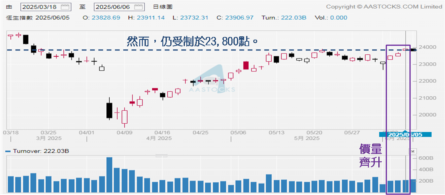 港股三连升止步,上周五 (6月6日) 恒指开于23,941点,无异于开于全日高位23,951点 (见于上午9:43)。开市后不足十五分钟渐见下移,尾市不足半小时录得全日低位23,773点,与收市位23,792点相距不到20点;即开近全日高位及收近全日低位,下跌114点,并再度收低于23,800点。虽于上周四 (6月5日) 收报23,906点,为今年3月21日以来最高,面对创近两个半月高的强势,却未能连续两天或以上收高于23,800点,证明恒指要企稳在此水平之上不易;犹幸港股投资热度未减,从过去四个交易日大市成交金额见证据支持。