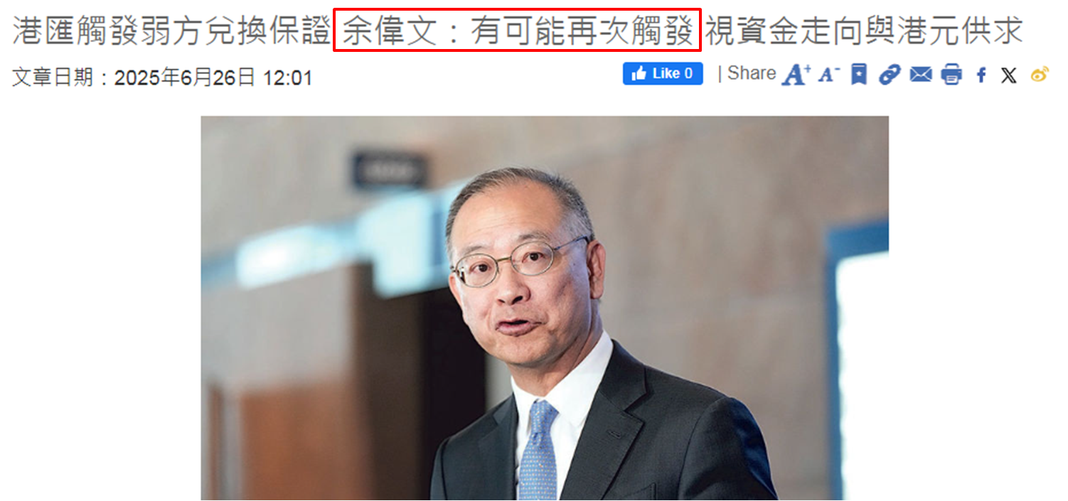 此外,上市公司派息高峰期接近尾声、非本地公司将招股或发债所得的港元资金兑换回笼,以及半年结相关的港元资金需求已大致完成筹措,市场对港元需求有所减少。他又表示,视乎资金的走向以及港元资金的供求情况,未来有可能会再次触发弱方兑换保证。市场解读7月开局港元依然偏弱,故不排除金管局有再度接港股沽盘可能。无独有偶,金管局出手当日,港股四连升止步,上周四恒指跌近150点。周五亦于接近下午2:00低见24,194点,回到上周二 (6月24日) 尾市水平,跌逾130点。