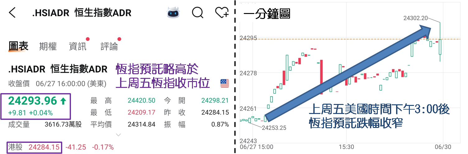 周五余下交易时间才见跌幅收窄;但见当晚美股造好,标指和纳指齐创新高,香港时间周末清晨3:00港股夜期收报24,182点,却跌67点。犹幸美股收市时,美国交易港股折合恒指预托收报24,293点,较上周五恒指收报24,284点,高出9点,令今日 (6月30日) 港股低开风险略为减少。惟应留意上周三恒指高见24,533点,最终收报24,474点;而周四和周五高位分别是24,411和24,471点,不难看出24,500点有阻力。倘若港汇走势与余伟文看法相乎,再度触发弱方兑换保证仅时间问题,将窒碍港股后续升势。