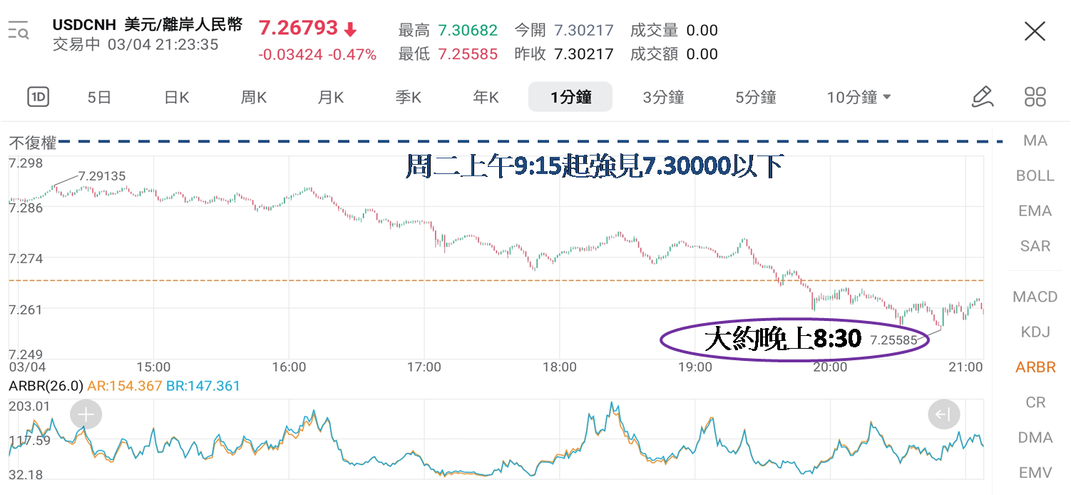 细节为对原产于美国的鸡肉、小麦、玉米、棉花,加征15%关税,高粱、大豆、猪肉、牛肉、水产品、水果、蔬菜、乳制品,加征10%关税;并宣布将15间美国实体列入出口管制管控名单,以及将10间美国企业列入不可靠实体列表。消息令人民币汇价有反应,周二美元兑人民币离岸价自上午9:15起强见7.30000以下,至下午13:10于7.28141,为日内港股交易期间最强位置,当时恒指高见23,051点不无道理。留意下午4:45起进一步走强,晚上约8:30强见7.25674;昨日截至下午4:00 (港股收市) 报7.25950,保持在7.26000以下,有利本月恒指继续向好。