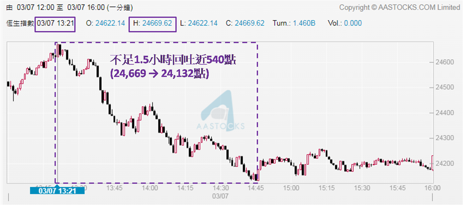 上周一及周二 (3月3及4日) 恒指表现平平,之后走势凌厉,周三及周四累升超过1,400点,收报24,369点,为2022年2月22日以来首度收高于24,000点,也是2022年2月18日以来最高收市位,相隔超过卅六个半月。两天急升后回调可以理解,笔者认为上周五恒指表现仍见惊喜,全日低位为24,065点 (见于开市不足半小时,跌逾300点),代表一直守稳24,000点关口,更于下午开市不足半小时一度高见24,669点,倒升300点。之后走势回软,最终下跌不足140点收市,报24,231点,自2022年2月18日以来第三高。