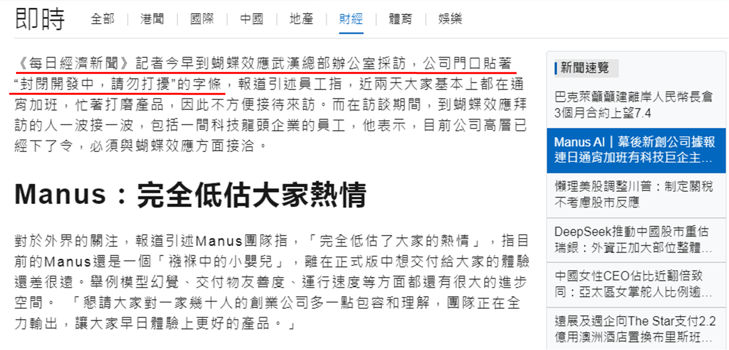 以上数据不难看出恒指上破25,000点前会见大沽压,参考2021年11月大市成交额接近2.9万亿元,虽然明显少于上述近7.8万亿元,不过在DeepSeek和两会的利好因素消化后,短期有否新的利好因素出现难料。继DeepSeek之后,另一间中国初创公司Butterfly Effect (蝴蝶效应),于3月6日上线人工智能软件Manus,亦引起科技界哄动。Manus被称为全球首款AI Agent,能直接执行各种任务,包括写PPT、找房子、分析股票等。有内媒于3月7日到蝴蝶效应武汉总部办公室采访,公司门口贴着「封闭开发中,请勿打扰」的字条,未能采访成功。
