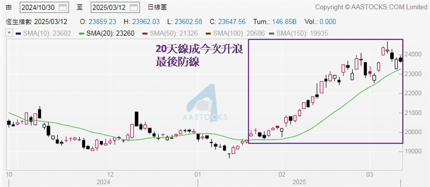上周五 (3月7日) 起恒指见三连跌,累跌近600点,不过若以3月7日高见24,669点和3月11日低见23,238点比较,表现最差之时回调逾1,400点,当时不少投资者担忧港股今次升浪完结可以理解。回顾今年升浪由1月13日低见18,671点开始,正值DeepSeek的AI开源大模型面世,中资科技股获估值重塑,于是大市节节上升。直至2月尾科技股升势渐见疲态,继而3月初在北京召开「两会」,资金开始流入「两会」主题板块,内需股、内房股、建材水泥股和中色金属股等接力,刺激恒指于3月7日一度高见24,669点,较18,671点累升近6,000点。