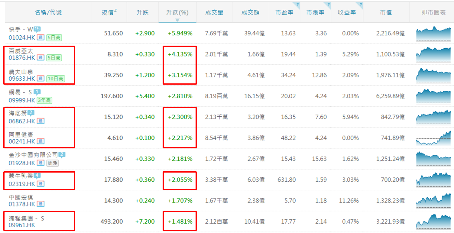 5月19日以来多次撰文时表示港股现为「炒股不炒市」形势,早初指出资金流入医药股,继而提到汽车股和消费类股份,同属追落后类型。参考昨日 (5月28日) 升幅最大十只蓝筹股当中,见到百威亚太 (1876)、农夫山泉 (9633)、海底捞 (6862)、阿里健康 (0241)、蒙牛乳业 (2319) 和携程集团─W (9961),升幅介乎4.14%至1.48%,占十大已逾半,全是消费类股份,一方面反映「炒股不炒市」继续;另一方面因着这等蓝筹股于恒指权重较小,就算见升也未能拉动恒指上扬,所以昨日跌逾120点,可以理解。