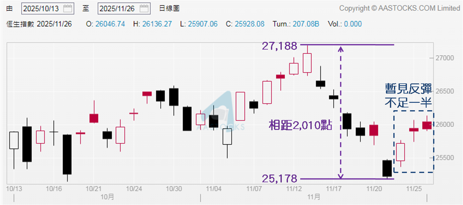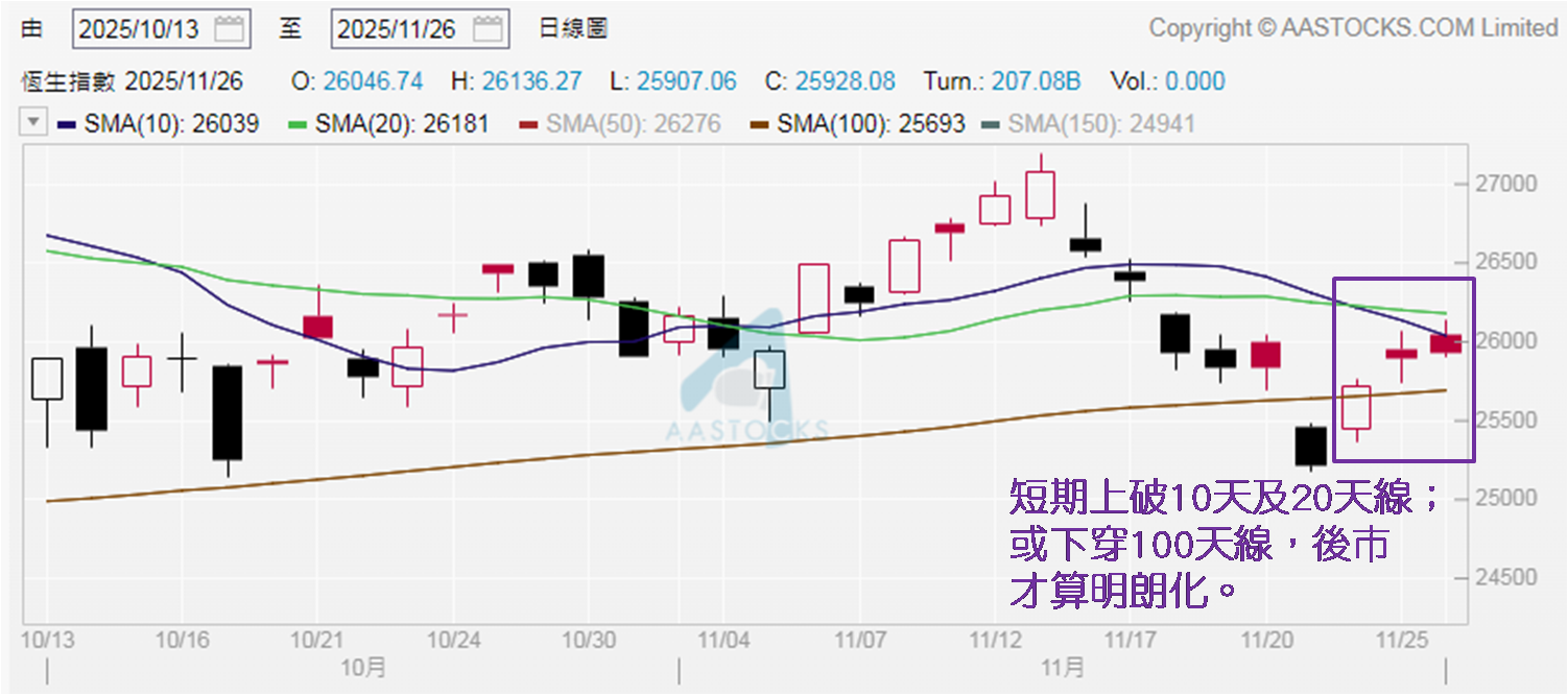 于11月24日发布市评文章时表示,11月25日晚上阿里巴巴─W (9988) 公布2025/26财政年度中期业绩,若于绩后见恒指走向明朗化,投资者再作部署为佳。综合以上分析,笔者认为恒指后市走向未算明朗化。短期要么见失守100天线确认续跌;要么企稳在26,200点之上,代表连带成功企稳在10天和20天线之上,预示有力续升,才算见后市明朗化。即或见后者情况,暂未见得恒指能走太远。毕竟自2021年7月26日至今,仅见三日收高于27,000点,所以恒指若要再挑战二万七关口,必须见利好内地经济国策加持方能成事。