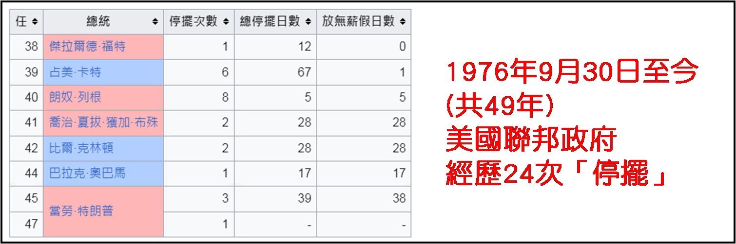 自美国国会预算程序于1974年7月12日生效至今,美国政府一共「停摆」24次 (包括今次),上述的35日暂为历来停摆最长日数,当时联邦政府210万名雇员中,约有80万人停工。根据美国广播公司 (ABC) 报道,今次停摆可能导致多达400万联邦雇员或被迫无偿工作;并有分析认为政府关门可能让美国经济每周损失约70亿美元 (约546亿港元)。此外,白宫早前在9月底要求联邦机构就潜在的政府停摆起草大规模裁员计划,令外界忧虑若见停摆历时较长,不少联邦雇员不单是短暂停工,更可能遭裁员。