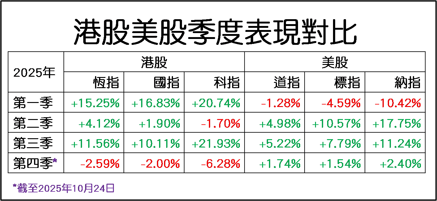 10月已近尾声,亦意味着2025年第四季差不多过了1/3,为对今年余下约两个月港股走势作判断,现时适合以季度为单位的方式看看年初至今港股和美股表现。暂见第一季反差最大,港股恒指、国指和科指分别累升15.25%、16.83%和20.74%;美股道指、标指和纳指则累跌1.28%、4.59%和10.42%。因表现反差大,大量流出美股资金,渐见流入港股,于2月7日录得今年首次单日大市成交金额超过2,000亿港元,实则迫近2,500亿元,约2,464亿元,为港股今年创历史新高交投,揭开序幕。截至10月24日今年过了201个交易日,日均成交额约2,577亿元。
