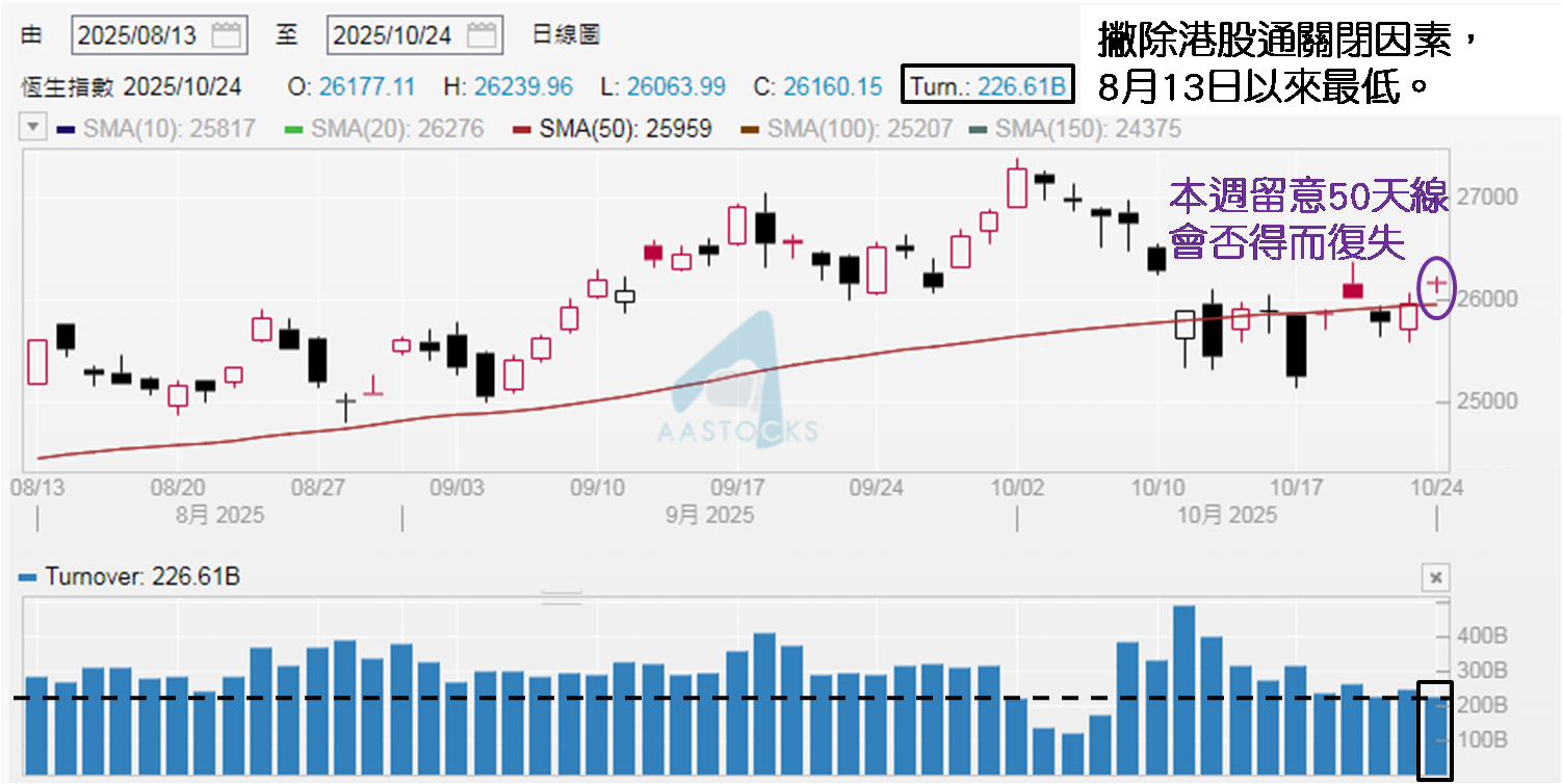 上周五美股三项指数同创新高,配合年初至今美股升幅较港股的仍落后超过15.00% (较截至9月底时差距约20.00%有所收窄),第四季余下日子资金从港股转投美股机会大。年初至今恒指、国指和科指分别累升30.41%、28.45%和35.63%,值得想想今年已过了3/4日子,坐拥约三成利润,对不少机构投资者而言今年余日子还有甚么诱因要继续拼搏呢?机构投资者显然不会舍易取难,相信美股第四季表现最终是优于港股的;但考虑到纳指第二季和第三季分别已升17.75%和11.24%,第四季升幅应逊于前两季,较可能少于10.00%,留意24,000点会否遇阻。至于港股,目前科指跌近6.30%,较10月初高位累跌近一成,本季要再挑战前高位6,715点机会不大,较有可能继续徘徊于5,800至6,600点之间。恒指较10月初高位则回调逾1,200点,倘于10月底未见收高于26,247点成功回补10月10和13日之间的下跌裂口,本季要再挑战前高位27,381点同样机会不大,本周续关注50天移动平均线会否再度得而复失。