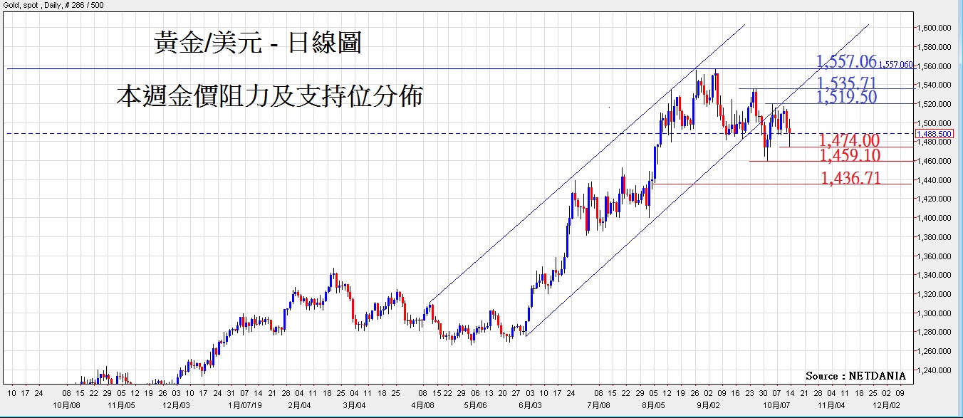 上週五 (11日) 即中美談判最後一日,特朗普在會後向記者表示談判進度非常順利,並宣佈在周六 (12日)再公布會議細節,在公布細節前 (即週五當日),港股在這利好消息下已急升600點。而避險資產方面,因避險情緒降溫,避險資產中的日圓及黃金遭拋售而回落。美元兑日圓方面,其實圓匯已從上週一 (7月)開始下跌, 可能是市場對今次談判的預期感到樂觀;週一美元兑日曾見最強水平106.55 ( 亦是全週圓匯最強水平)。隨後圓匯一直下跌至週末,最低曾跌至108.63,即特朗普宣佈喜訊的週五 (11日),最後在週五晚收市報108.37,全週圓匯跌幅達182點。黄金方面亦下跌, 上週最高曾見1517,在週五特朗普宣佈與中方談判有成果後,金價曾跌至1474,隨後收市在1488.50,全週跌幅達43美元。
